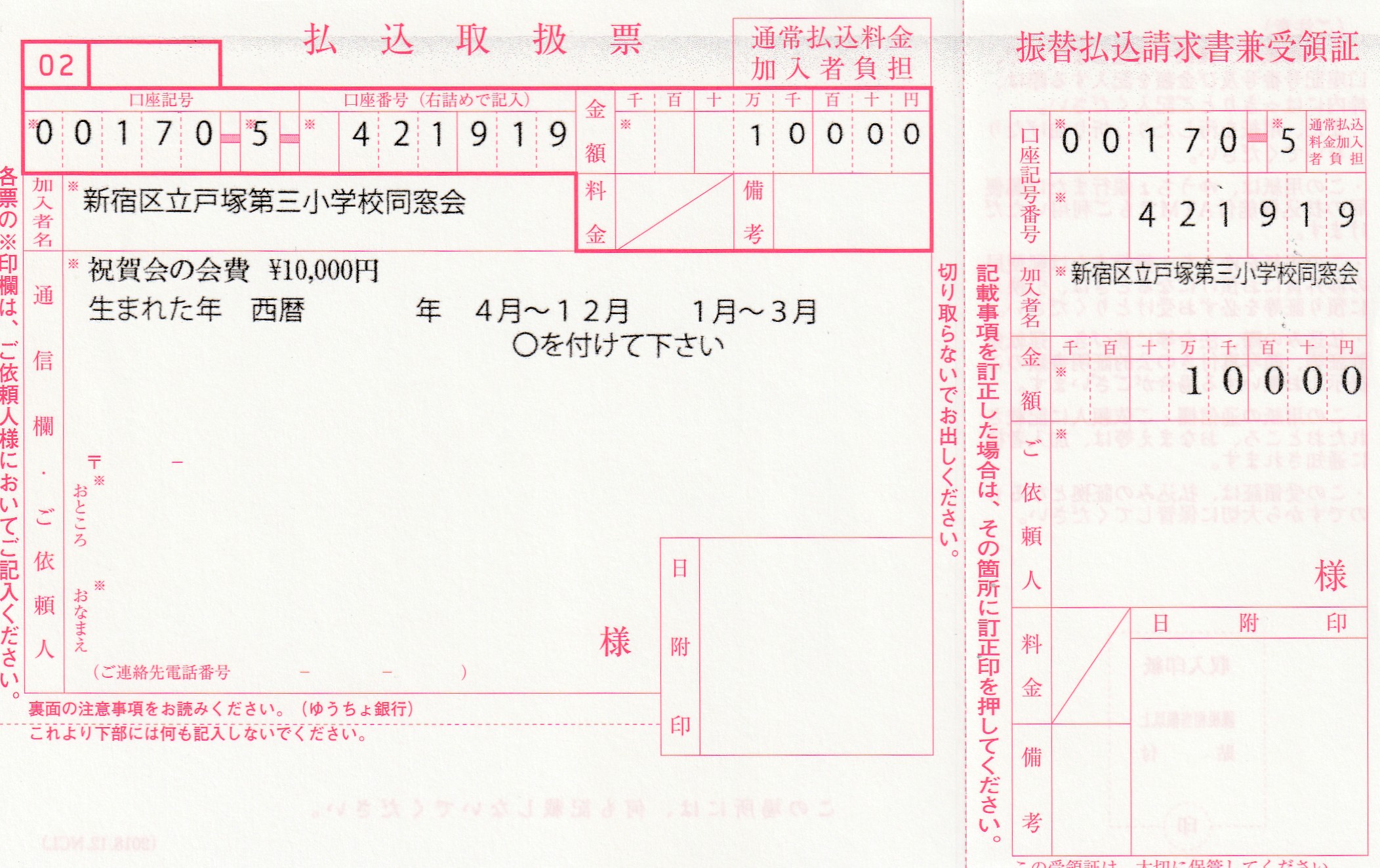 - 上記の振り込み用紙は郵便局かマツモトキヨシ薬局前のタバコ屋さんにありますので